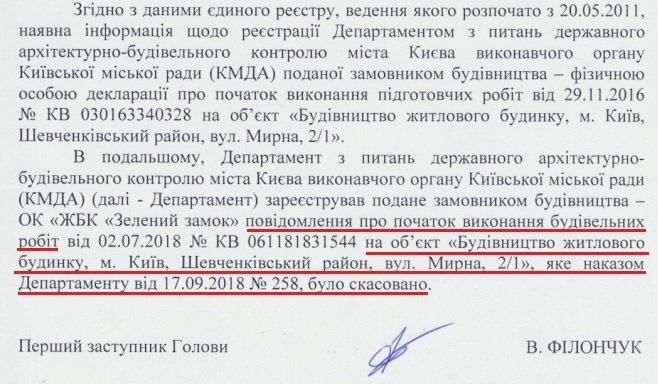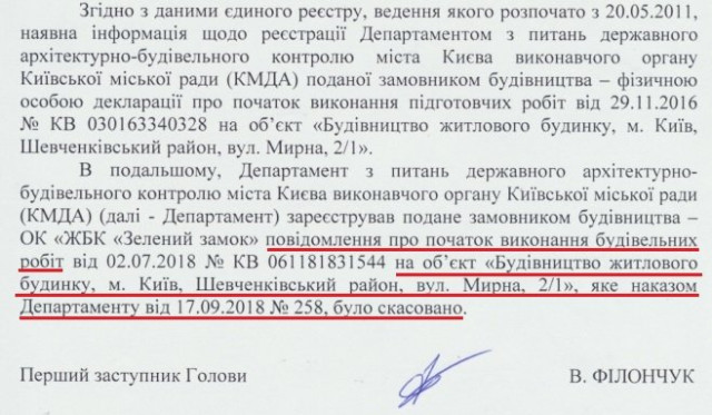 Департамент з питань державного архітектурно-будівельного контролю м. Києва у липні 2018 року зареєстрував подане замовником будівництва (ОК «ЖБК «Зелений замок», з яким Іван Влад уклав кооперативну угоду) повідомлення про початок виконання будівельних робіт. Однак, вже через кілька місяців, у вересні 2018 року, Департамент своїм наказом це повідомлення скасував.