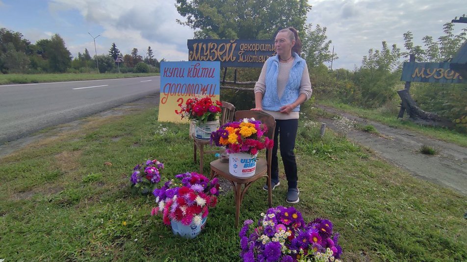 Квіти жінка продає біля свого обійстя-музею. Нині у неї можна придбати букети з айстр, майорів.