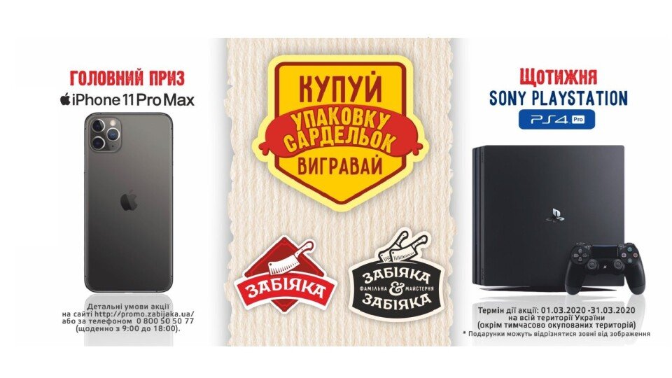 Компанія «Забіяка» дає можливість виграти круті подарунки за купівлю упаковки сардельок. Щотижня відбуватимуться розіграші ігрових приставок Sony PlayStation, а наприкінці місяця – розіграш iPhone 11ProMax!