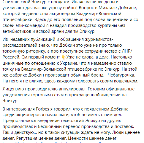 «Питання у Михайлові Добкіну, який нещодавно став акціонером Володимир-Волинської птахофабрики. Тут до його появи під своєю ліцензією та зі своєю епі-командою я налагодив виробництво курятини без антибіотиків і всякої погані для ТМ Епікур. З недавніх публікацій та звернень журналістів-розслідувачів знаю, що Добкін це вже не лише про токсичну риторику, а про злочинну співпрацю з «ЛНР»/Росією. Вже не слова, а справи. Настільки цинічні щодо України, що я негайно ставлю крапку на Володимир-Волинській птахофабриці по Епікуру. На цій же фабриці Добкін виробляє звичайний бренд – Чебатурочка. На нього я не впливаю, тут кожному голосувати своїм гаманцем», – написав Коваленко.«Готуємо офіційні повідомлення торговельним мережам про припинену ліцензію на Епікур», – підкреслив він.Як ми писали, Володимир-Волинська птахофабрика була рейдерськи захоплена кілька років тому. Про це в інтерв’ю КП в Україні заявив керуючий партнер підприємства Григорій Соломанін. Він зазначив, що в 2009 році рішенням суду Херсонської області акції фабрики були переписані на третіх осіб. Підприємець розповів, що поки він в різних судах 12 років намагається повернути власність, доходи від роботи Володимир-Волинської птахофабрики йдуть іншим. Зокрема – народному депутату Михайлу Добкіну, який стверджує, що фабрику успадкував від батька.