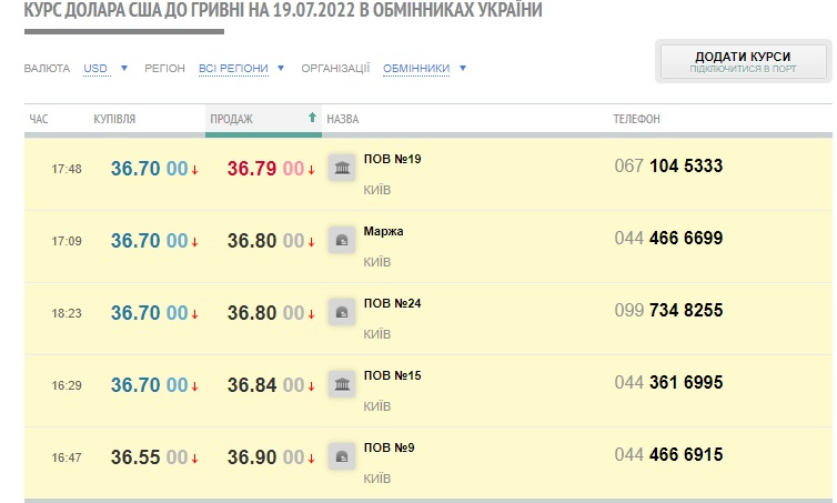 Водночас джерела повідомляють, що Нацбанк разом із Державною податковою службою розгорнули перевірки валютних обмінників небанківських фінустанов (фінансових компаній). Цим пояснюють зниження останні кілька днів у них курсу готівкового долара – у середньому на 1 гривню. У небанківських структур він просів на продаж населенню нижче 37,0 грн/$. На вечір 19 липня їхні ціни перебували у межах 36,79-36,90 грн/$.Водночас у банків курс продажу долара досягав максимум 38,0 грн/$, а середній діапазон був на рівні 37,0-37,60 грн/$.Державні банки тримали такі курси купівлі/продажу готівкового долара: