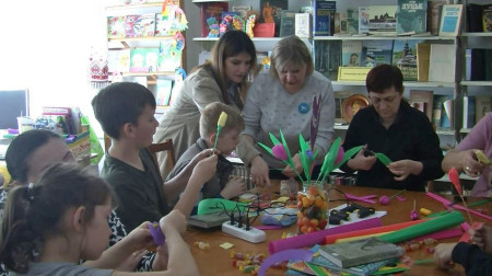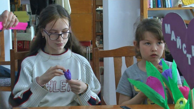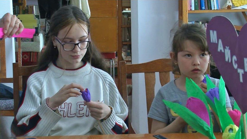 «Ми робимо букети з цукерок: цукерочки, замотані в гофрований папір. Матеріали принесли самі, бо ми працюємо з нашими благодійниками і матеріали даємо безкоштовно», – говорить завідувачка відділу культури та мистецтв бібліотеки.Виготовляла квіти з гофрованого паперу робить Наталія Бондаренко разом із дев’ятирічним сином Єгором, котрі місяць тому приїхали до Луцька з Сєвєродонецька. У рідному місті жінка працювала вчителькою початкових класів і зараз, говорить, продовжує навчати дітей дистанційно.