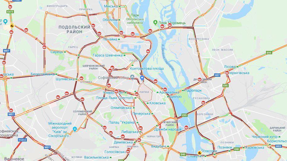 Згідно сервісу Google Maps, найбільше ускладнено рух у центрі столиці, на Набережному шосе, по Повітрофлотському проспекту, вулиці Вадима Гетьмана, Олени Теліги, по проспекту Перемоги, Кільцевій дорозі, на Софіївській Борщагівці.