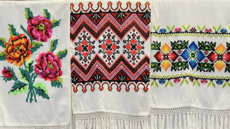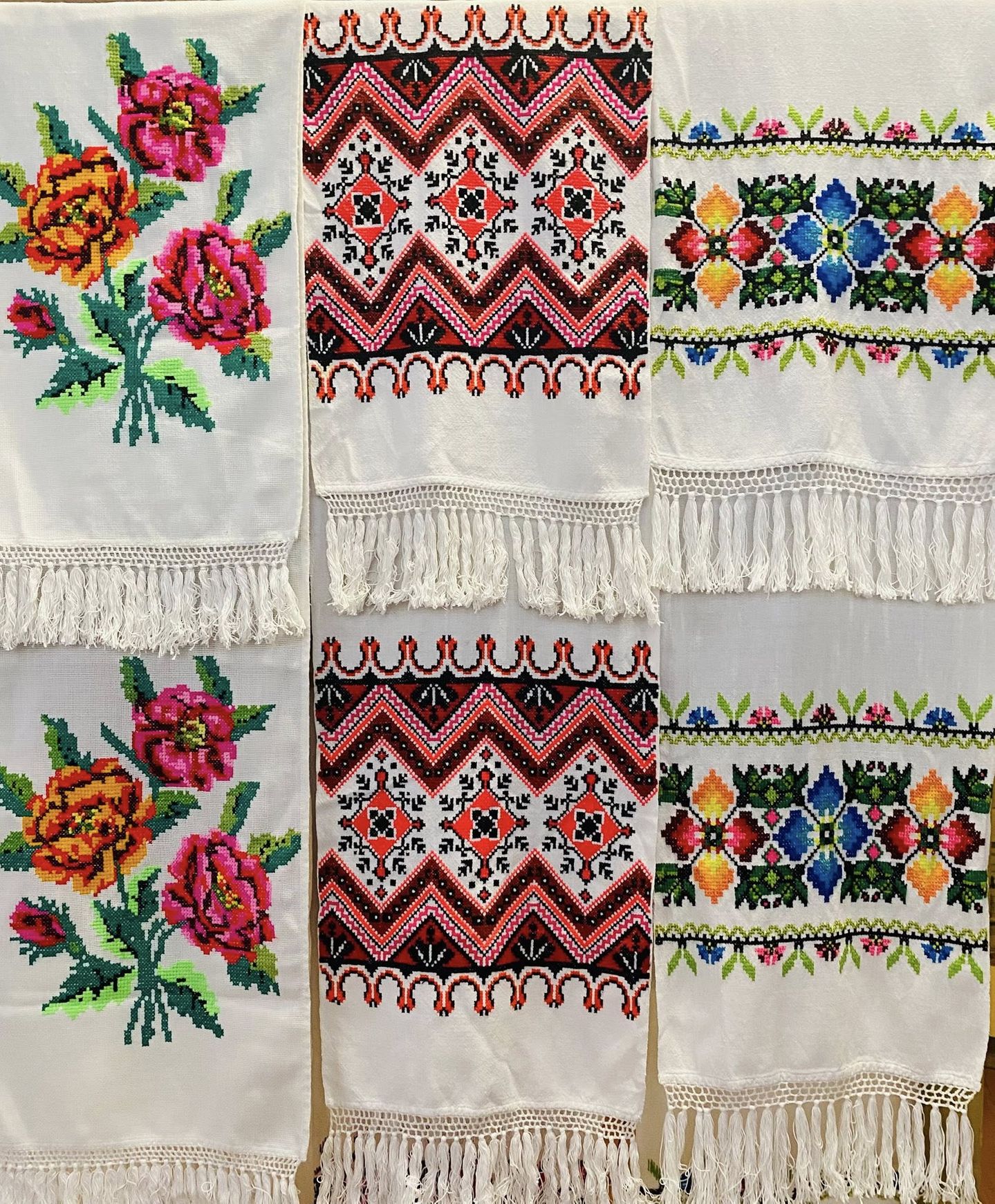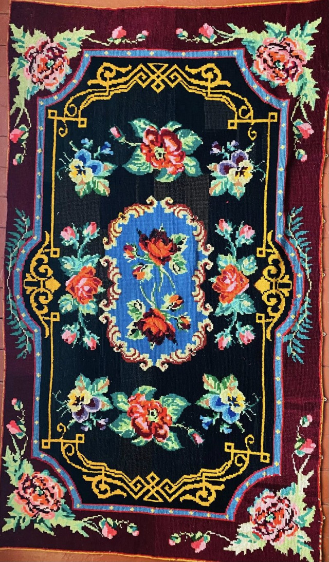 «Мати Галини Сидорук ткала рядна з вовни у селі Топилище. Вовну теж виготовляли власноруч: тримали овець, пряли нитки, а з них вже ткали рядна. А килим хрестиком вишила мати Леоніда Сидорука. Вона працювала вчителькою, мала таке хобі, цікавилася вишивкою. Думаю, що це не єдина її робота», – сказала Лариса Куль.Килим, вишитий хрестиком Ольгою Ярощук.