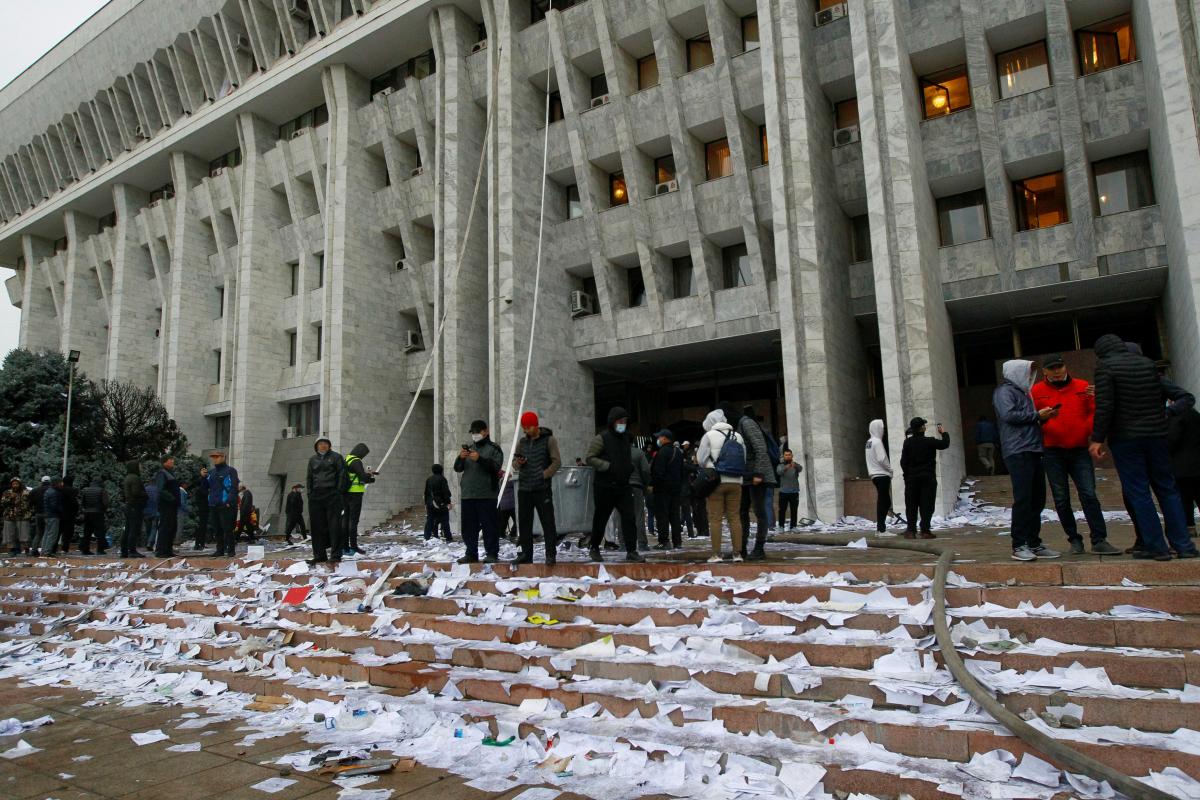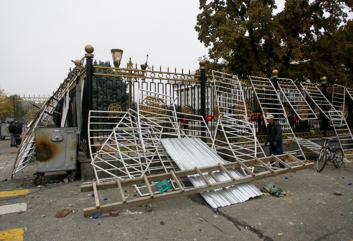 У центрі Бішкека демонстранти заблокували низку вулиць підпаленими сміттєвими баками. У відповідь силовики почали на них наступати, застосовуючи, за даними ЗМІ, водомети, гумові кулі та світлошумові гранати.Мітингувальники захопили Білий дім, а також звільнили експрезидента Атамбаєва з СІЗО Держкомітету нацбезпеки. Після протестів у Бішкеку підпалили будівлю Білого дому.