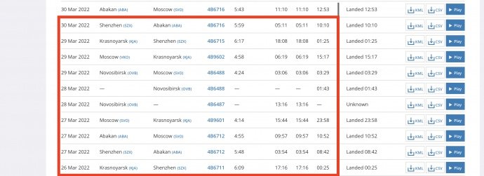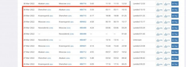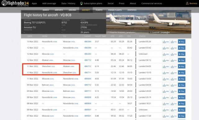 Натомість дані публічних онлайн радарів свідчать що всі 5 літаків після крадіжки та перереєстрації в Росії регулярно літають до Китая. Загалом таких перельотів від початку війни було здійснено більше двадцяти.Також деякі з зазначених літаків декілька разів літали до Єгипту та Бахрейну.