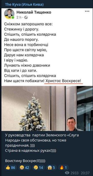 Кива виклав скріншот побажання Тищенка з Різдвом, у якому той допустився помилки й привітав українців з Великоднем. «Христос Воскрес!» – написав Тищенко у Фейсбуці, переплутавши з фразою «Христос народився».