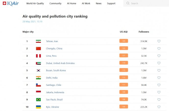 Слід зауважити, що найбруднішим зараз є іранський Тегеран, а от відома своїм брудним повітрям столиця Китаю Пекін наразі має індекс 61 (задовільно).