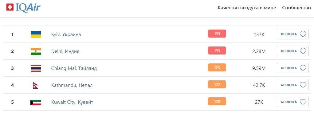 При допустимій нормі індексу забруднення у 50 в українській столиці цей показник склав 155. До п'ятірки рейтингу, крім Києва, також увійшли Делі, Кувейт, Таїланд і Непал. Як повідомлялося, протягом кількох днів у середині квітня в повітрі в Києві був сильний запах продуктів горіння, спостерігалася задимленість. У ДСНС пояснили, що це пов'язано з пожежами трав'яного настилу та лісової підстилки в Київській і Житомирській областях, дим від яких до столиці розносить вітер. Влада міста закликала жителів зачинити вікна і не виходити на вулицю.