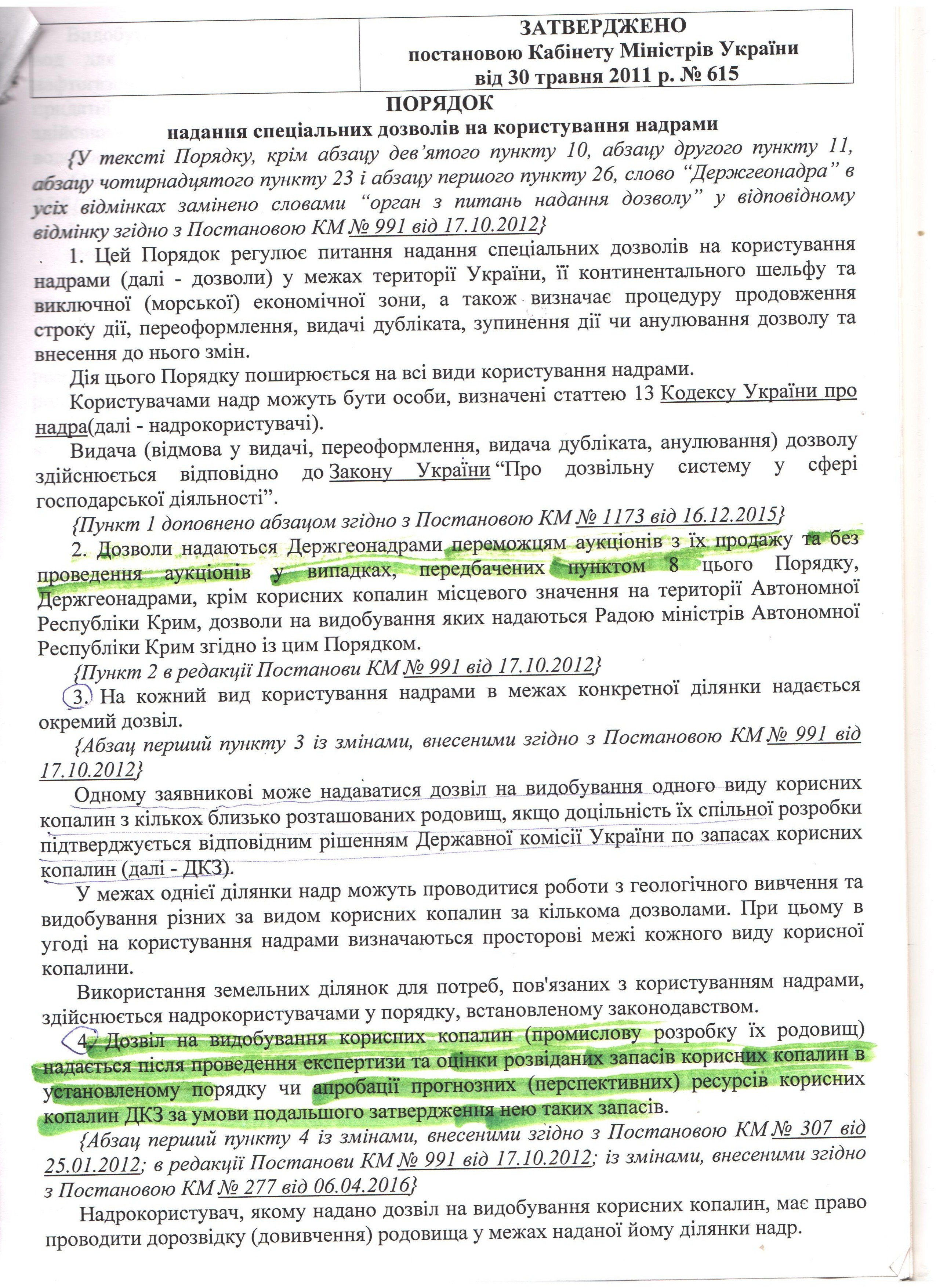 Зі слів Лапіна, державні підприємства мають отримувати ліцензії безкоштовно, комунальні та приватні – купувати. При цьому Лапін згадує постанову Кабміну №615 і говорить про те, що КП «Волиньприродресур» отримало спеціальний дозвіл на користування надрами без проведення аукціону нібито всупереч цій постанові, «маніпулятивним шляхом», і зараз за цим фактом відкрите кримінальне провадження. Якщо розібратися в ситуації, то в постанові передбачено видання спецдозволів без проведення закону в окремих випадках, як наприклад, після здійснення апробації прогнозних (перспективних) ресурсів корисних копалин ДКЗ (державна комісія по запасах) за умови подальшого затвердження нею таких запасів – саме цю умову виконало КП «Волиньприродресур».