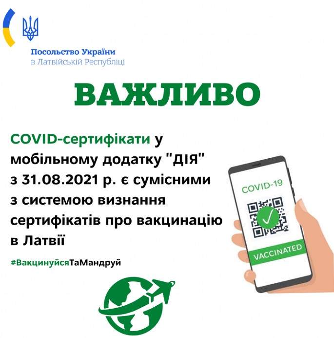 Там заявили, що COVID-сертифікати, які отримали громадяни України у мобільному застосунку «Дія» та QR-код для їхньої перевірки, є сумісними з чинною системою визнання сертифікатів про вакцинацію проти коронавірусу в Латвії.Там зауважили, що якщо під час сканування QR-коду інформація показується неправильно, то необхідно або перезавантажити, або оновити сертифікат про вакцинацію у застосунку.