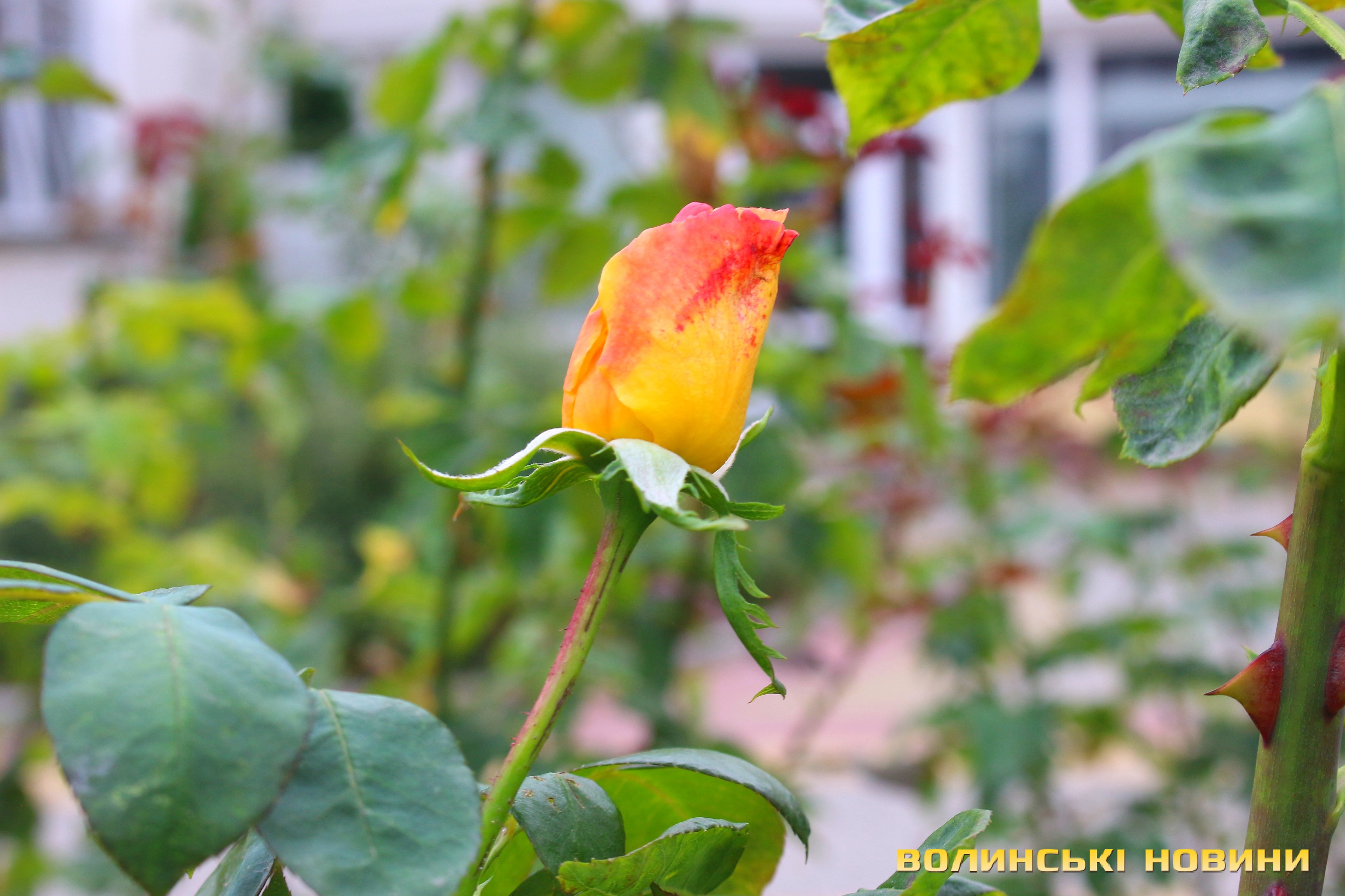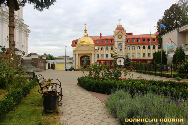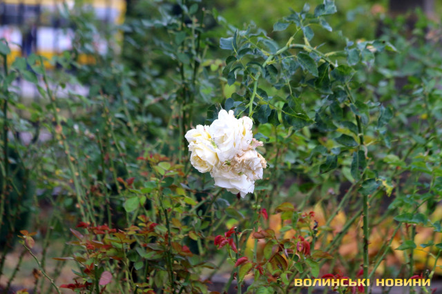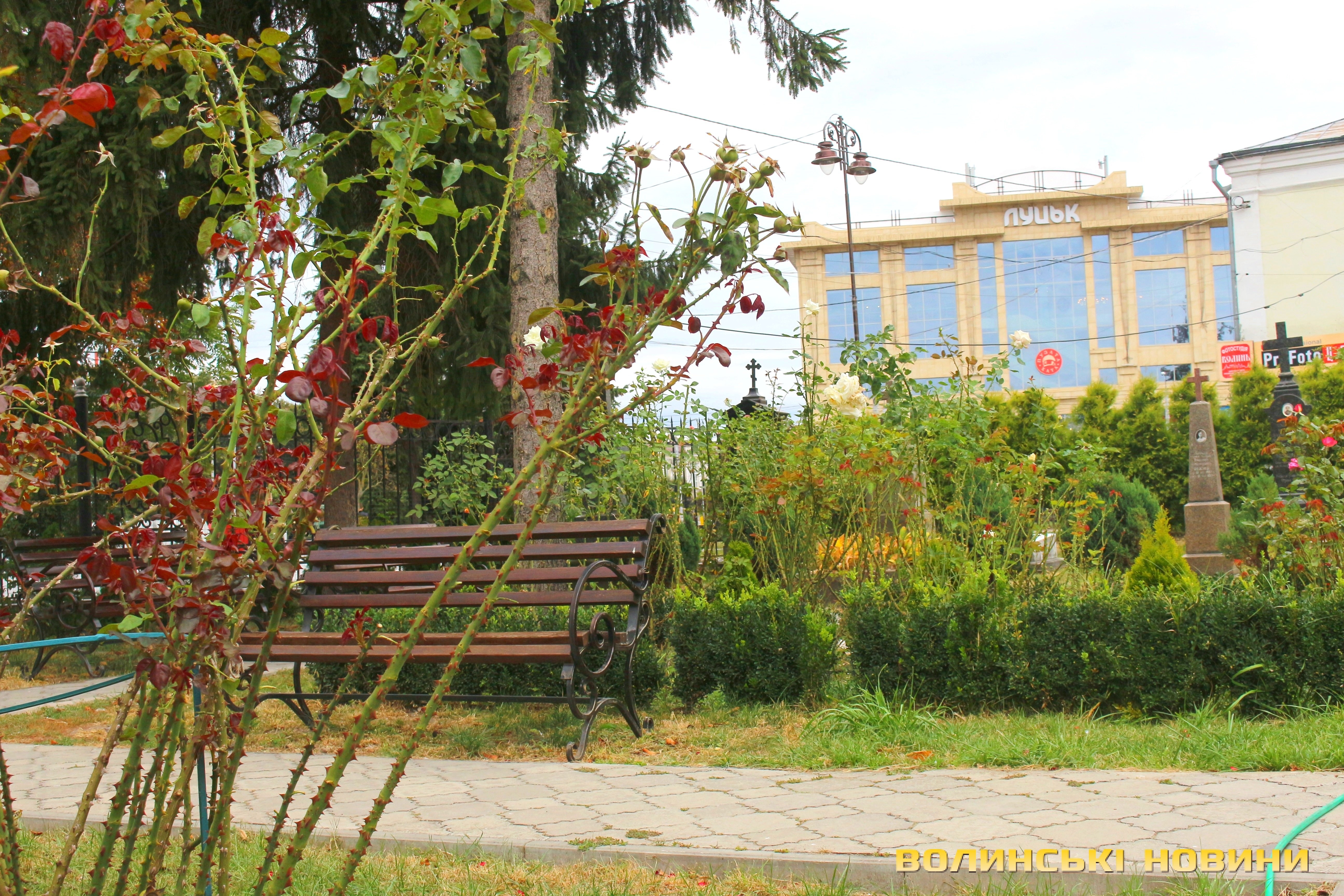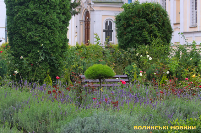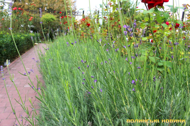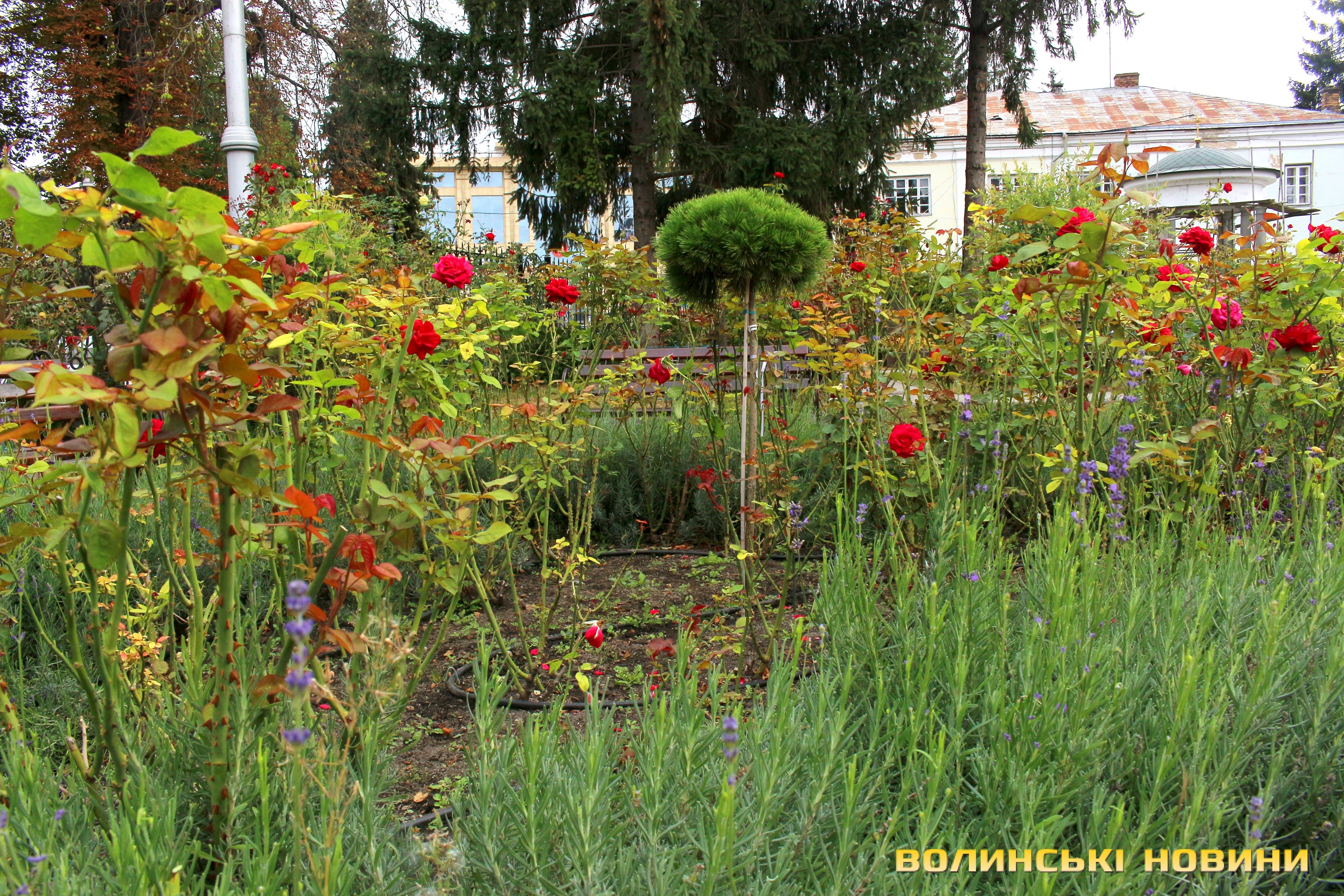 Навіть в осінню пору на території Свято-Троїцького кафедрального собору, що в центрі Луцька, квітують різнобарвні троянди та запашна лаванда.