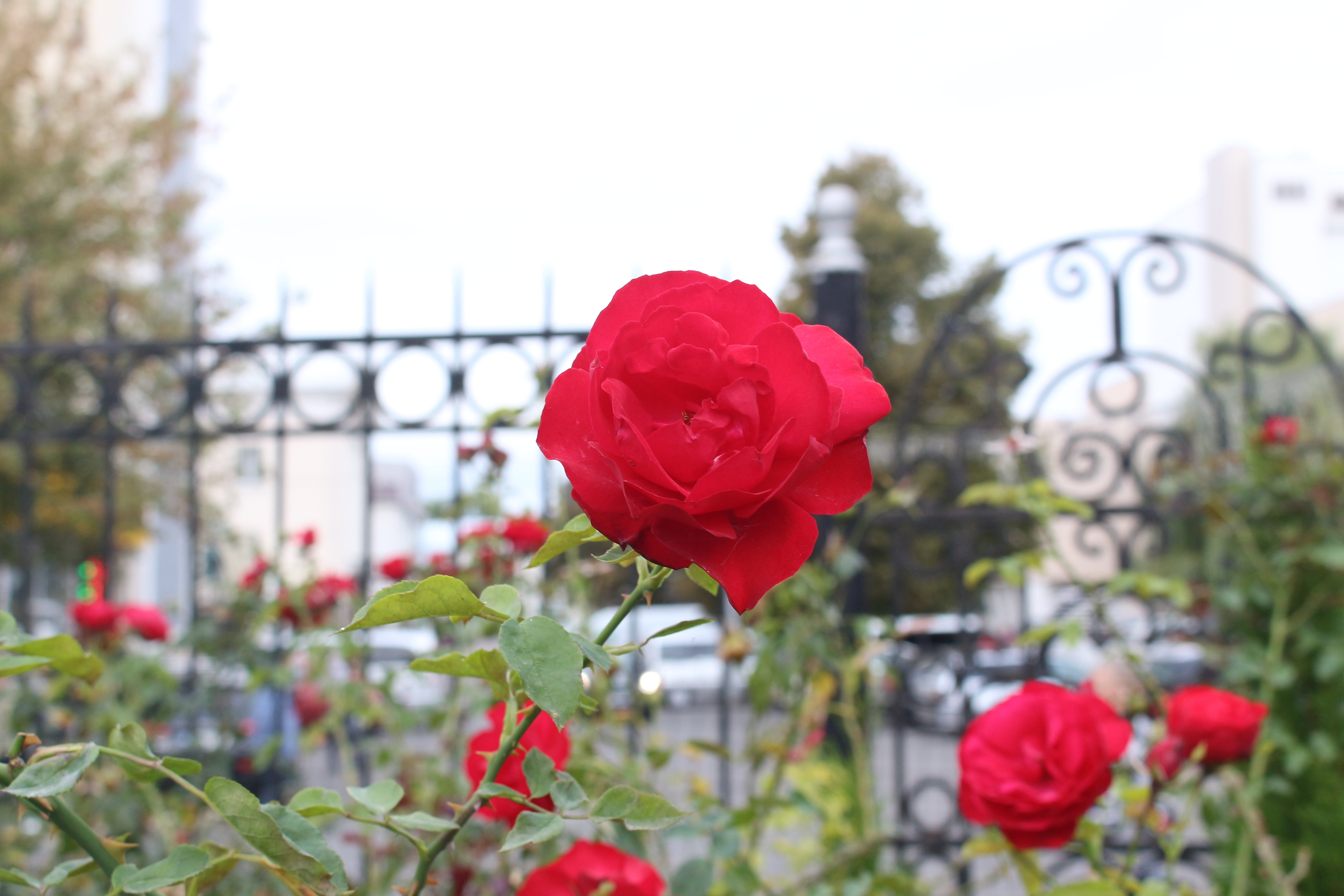 Здається, що трояндовий квітник біля храму «забув», що незабаром – заморозки та холоди. Особливо яскраві квіти виділяються на фоні сірого осіннього неба.