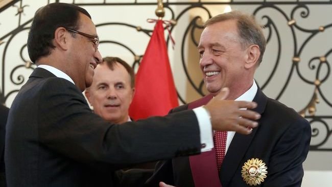 На фото: ВИЗНАННЯ ЗАСЛУГ. НАДЗВИЧАЙНИЙ І ПОВНОВАЖНИЙ ПОСОЛ РЕСПУБЛІКИ ПЕРУ В УКРАЇНІ ЗА СУМІСНИЦТВОМ (З РЕЗИДЕНЦІЄЮ У ВАРШАВІ) АЛЬБЕРТО САЛАС БАРАОНА ВРУЧАЄ ОЛЕКСАНДРУ МИХАЛЬЧУКУ ВИЩУ ДЕРЖАВНУ ЦИВІЛЬНУ НАГОРОДУ СВОЄЇ КРАЇНИ – ОРДЕН «СОНЦЕ ПЕРУ» В СТУПЕНІ «ВЕЛИКИЙ ХРЕСТ» / ФОТО РУСЛАНА КАНЮКИ / «День»