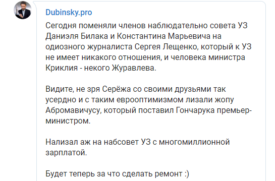 «Сьогодні поміняли членів наглядової ради «Укрзалізниці» Даніеля Білака і Костянтина Мар’євича на одіозного журналіста Сергія Лещенка, який до «УЗ» не має ніякого відношення, і людину міністра Криклія – такого собі Журавльова», – написав Дубінський в своєму Telegrаm-каналі.При цьому, дружина екснардепа Сергія Лещенка Анастасія Топольська (DJ Nastya) в суботу виступить у Росії. Про це вона повідомила в своєму Instagram-акаунті.
