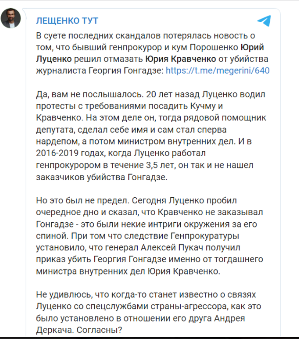 Запідозрити зв’язок зі спецслужбами РФ Лещенка змусила новина про те, що Луценко «вирішив відмазати Юрія Кравченка від убивства журналіста Георгія Гонгадзе», як сказав Лещенко. Мовляв, Луценко сказав, що Кравченко не замовляв Гонгадзе – це були якісь інтриги оточення за його спиною.