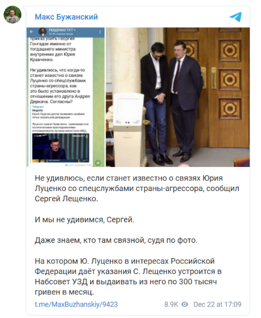 «Не здивуюся, якщо стане відомо про зв’язки Юрія Луценка зі спецслужбами країни-агресора, повідомив Сергій Лещенко. І ми не здивуємося, Сергію. Навіть знаємо, хто там зв’язковий, судячи з фото. На якому Ю. Луценко на користь Російської Федерації дає вказівки С. Лещенку влаштуватися до Наглядової ради УЗД і видавати з неї по 300 тисяч гривень на місяць», – коментує Бужанський у своєму Телеграмі.Нагадаємо, за дев’ять місяців роботи в «Укрзалізниці» викривач агентів російських спецслужб Лещенко заробив понад 6 мільйонів гривень.
