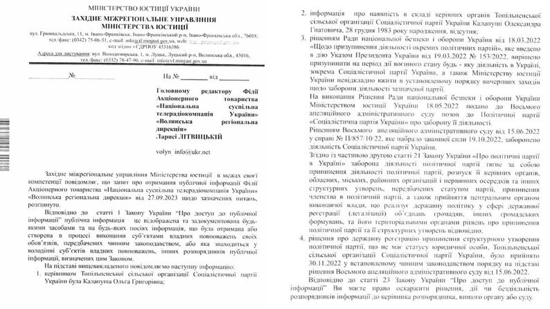За роз’ясненням лікар звернувся із листом у Мін’юст. Каже: отримав відповідь, що згідно з Єдиним реєстром громадських формувань Калапуша Олександр Гнатович не входить до складу керівних органів політичних партій в Україні. Але Калапуша О.Г. є серед керівників Топільненської сільської організації Соціалістичної партії України, втім інформації про повне ім’я та по батькові немає.
