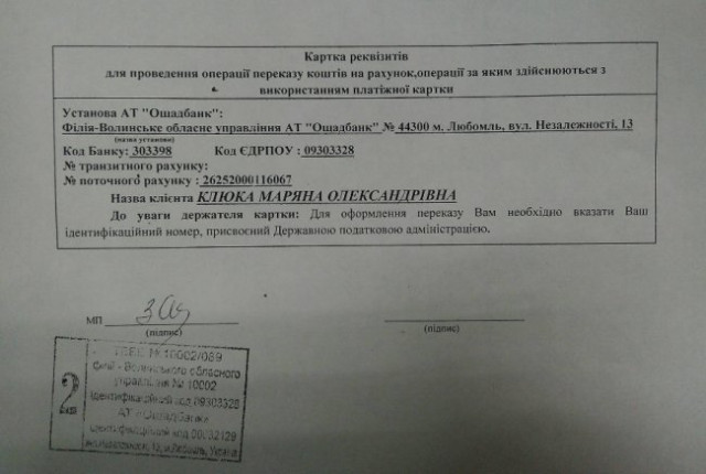 Усі, хто має хоча б мінімальну можливість підтримати родину Тамари Чуб фінансово, просять здійснити переказ коштів на рахунок її доньки:
