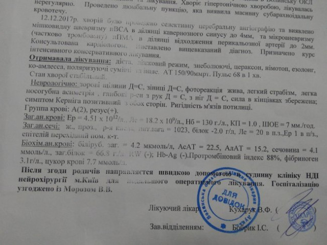 Термінова операція буде проводитись в судинній клініці НДІ нейрохірургії міста Київ . Її вартість – 100 000 гривень.