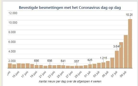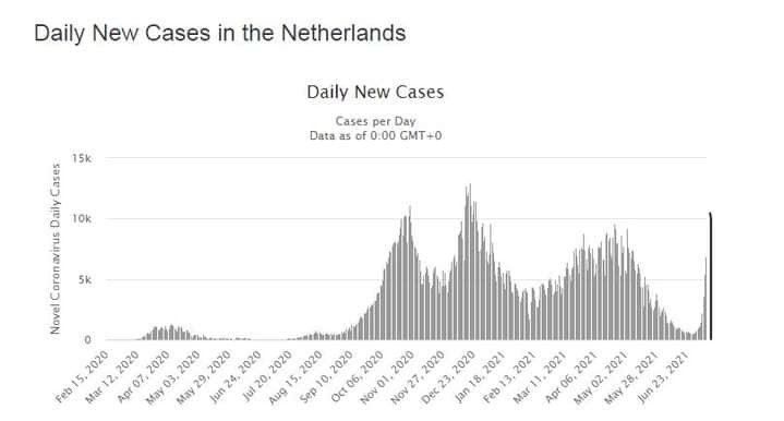 Кількість інфікувань Covid-19 у Нідерландах за 11 днів зросла у 19 разів – із 538 до 10283 випадків. Населення країни – 17 мільйонів людей, при цьому вже зроблено 17 мільйонів щеплень, повністю вакциновано 7 мільйонів осіб, однак це не зупинило стрімкий злет захворюваності.