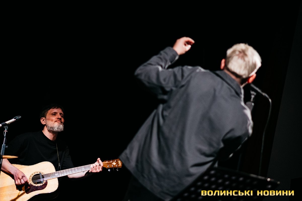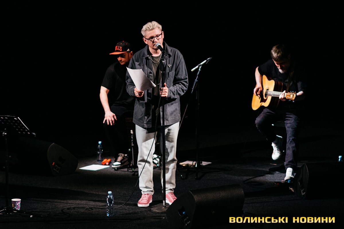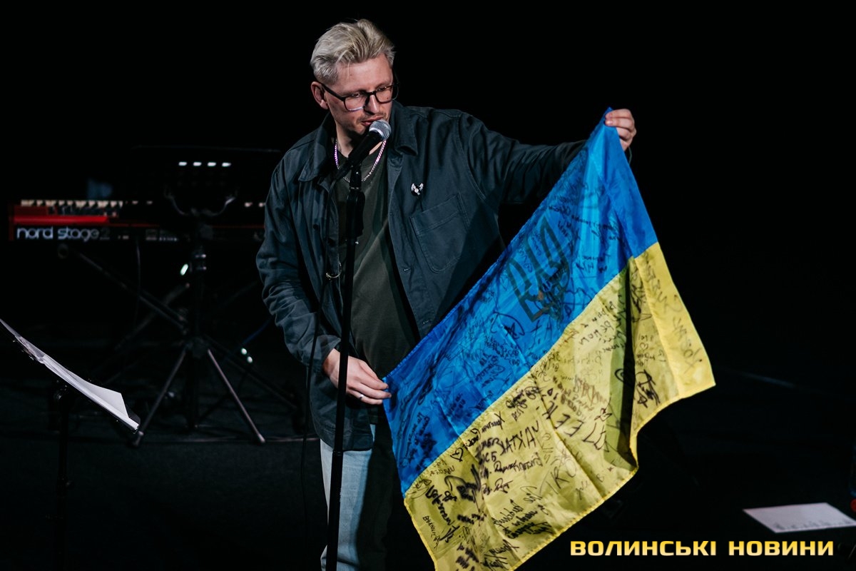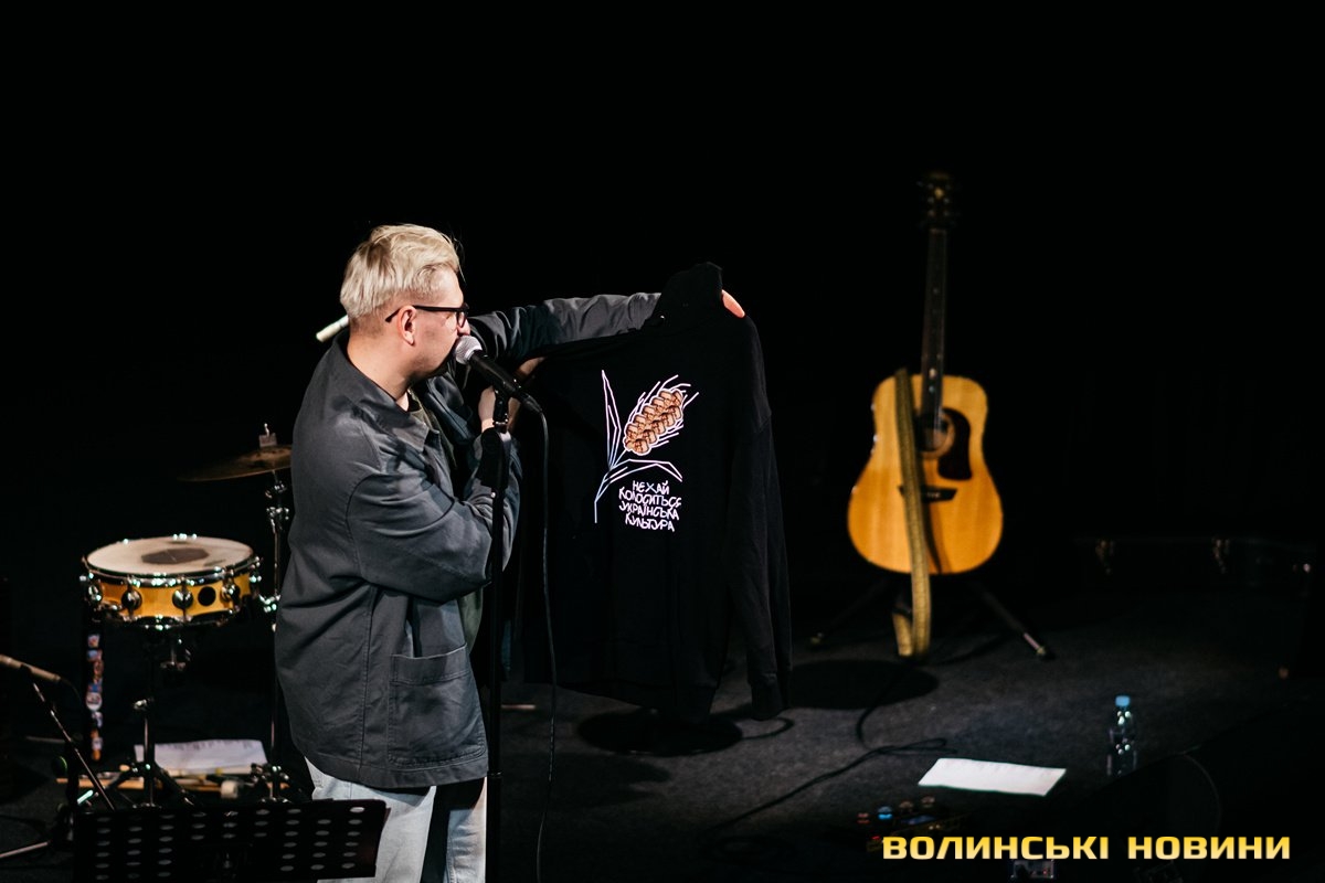 Неймовірно атмосферно звучали вірші Сергія Мартинюка в авторському виконанні.Під час концерту вже традиційно фронтмен «Фіолету» провів аукціон, кошти з якого підуть на «Мавіки» для 77-ї окремої аеромобільної бригади, яка працює на Купʼянському напрямку.«Ви знаєте, що «Мавіки» – річ недешева, але в умовах війни є розхідником. Тож ми із друзями з «Ангару» збираємо на них гроші. Маємо зібрати мільйон гривень. Вже понад 700 тисяч є, тож сподіваємося, що під час туру вдасться закрити цей збір і допомогти хлопцям та дівчатам», – висловив надію Сергій Мартинюк.І варто сказати, що шанувальники з Луцька його не підвели. Першим з молотка пішов канадський сухпайок для військових. Далі глядачам запропонували придбати синьо-жовтий стяг з автографами українських зірок. Неабияка боротьба між учасниками аукціону розгорнулася за торт із зображенням фронтмена гурту. Останнім лотом став оригінальний світшот, виготовлений у єдиному екземплярі.«Цей светрик наприкінці минулого року мені подарував один з побратимів. Светрик теплий, зимовий, з дуже прикольним принтом. Там написано «Нехай колоситься українська культура», а на колоску – багато моїх задуманих облич. І ми вирішили його, так би мовити, монетизувати. Такого ви точно більше ніде не знайдете», – заохотив Колос учасників аукціону.Читати ще: Українські актори знялися в поетичному проєкті для людей з порушенням слуху та зору