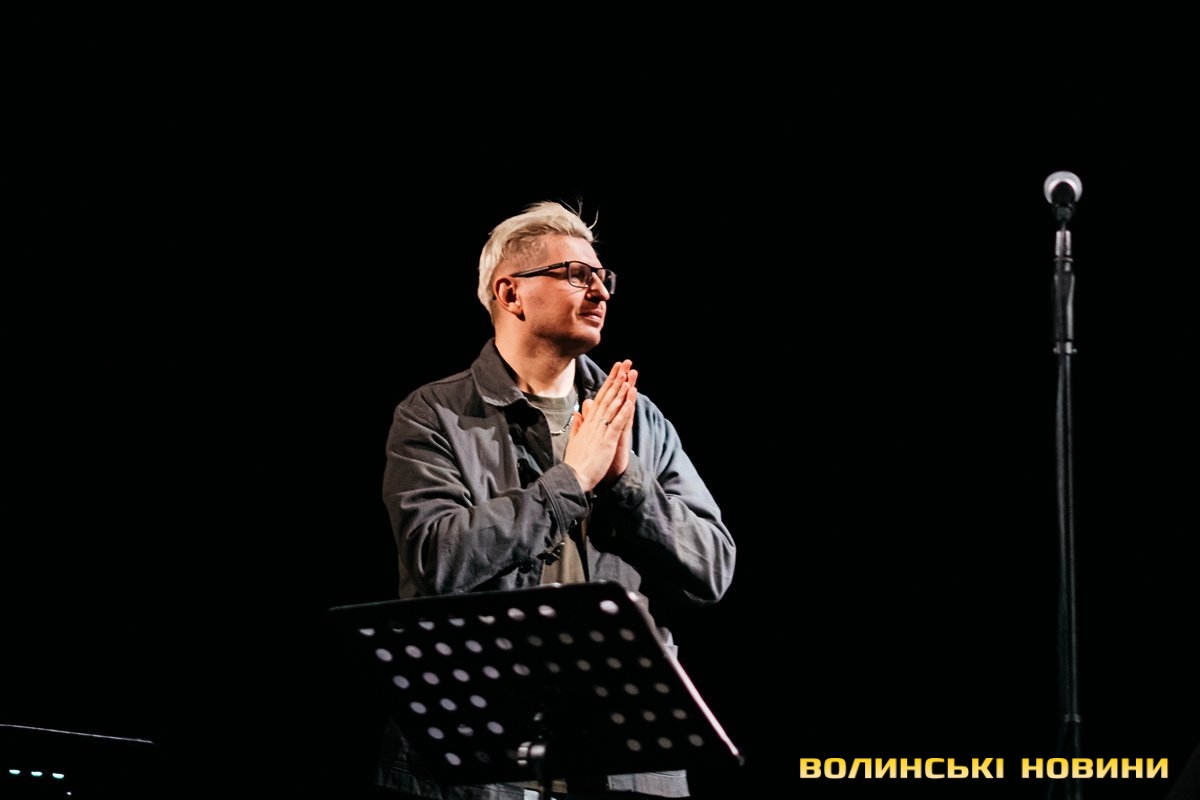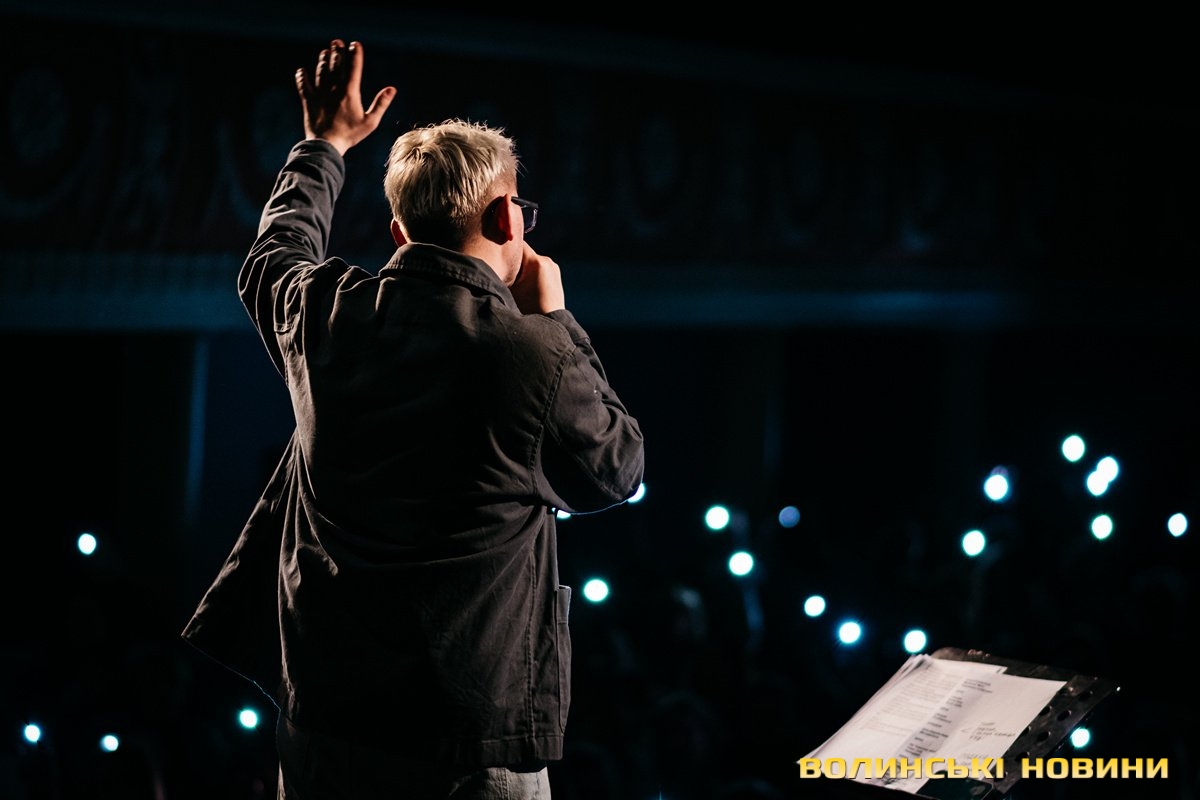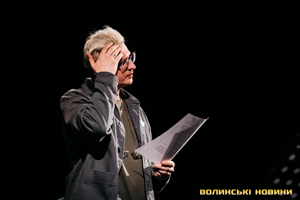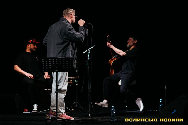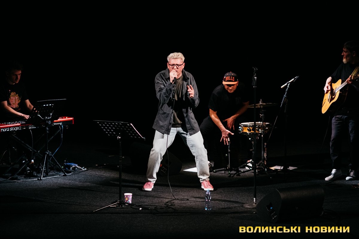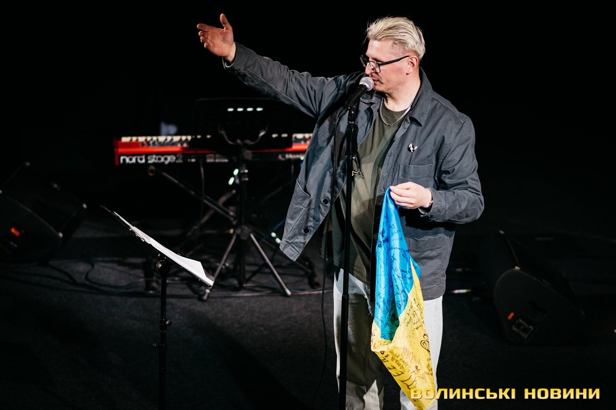 Неймовірно атмосферно звучали вірші Сергія Мартинюка в авторському виконанні.Під час концерту вже традиційно фронтмен «Фіолету» провів аукціон, кошти з якого підуть на «Мавіки» для 77-ї окремої аеромобільної бригади, яка працює на Купʼянському напрямку.«Ви знаєте, що «Мавіки» – річ недешева, але в умовах війни є розхідником. Тож ми із друзями з «Ангару» збираємо на них гроші. Маємо зібрати мільйон гривень. Вже понад 700 тисяч є, тож сподіваємося, що під час туру вдасться закрити цей збір і допомогти хлопцям та дівчатам», – висловив надію Сергій Мартинюк.І варто сказати, що шанувальники з Луцька його не підвели. Першим з молотка пішов канадський сухпайок для військових. Далі глядачам запропонували придбати синьо-жовтий стяг з автографами українських зірок. Неабияка боротьба між учасниками аукціону розгорнулася за торт із зображенням фронтмена гурту. Останнім лотом став оригінальний світшот, виготовлений у єдиному екземплярі.«Цей светрик наприкінці минулого року мені подарував один з побратимів. Светрик теплий, зимовий, з дуже прикольним принтом. Там написано «Нехай колоситься українська культура», а на колоску – багато моїх задуманих облич. І ми вирішили його, так би мовити, монетизувати. Такого ви точно більше ніде не знайдете», – заохотив Колос учасників аукціону.Читати ще: Українські актори знялися в поетичному проєкті для людей з порушенням слуху та зору