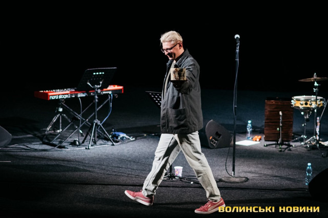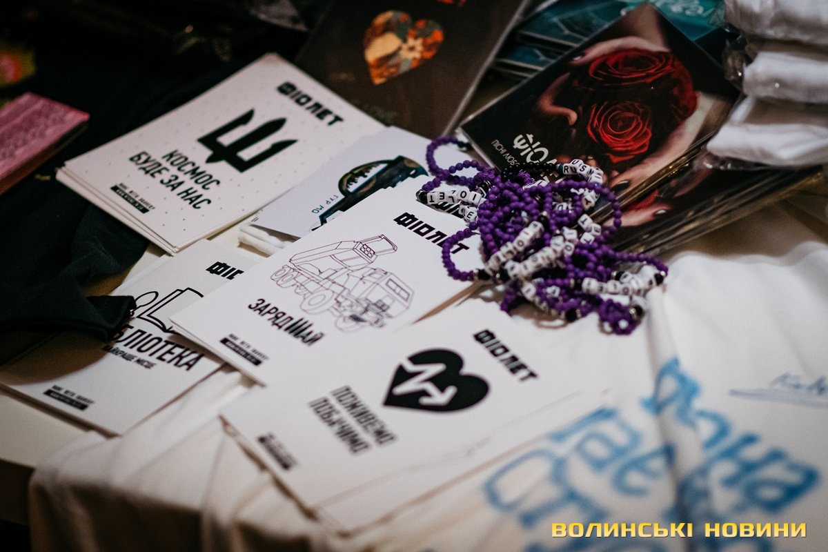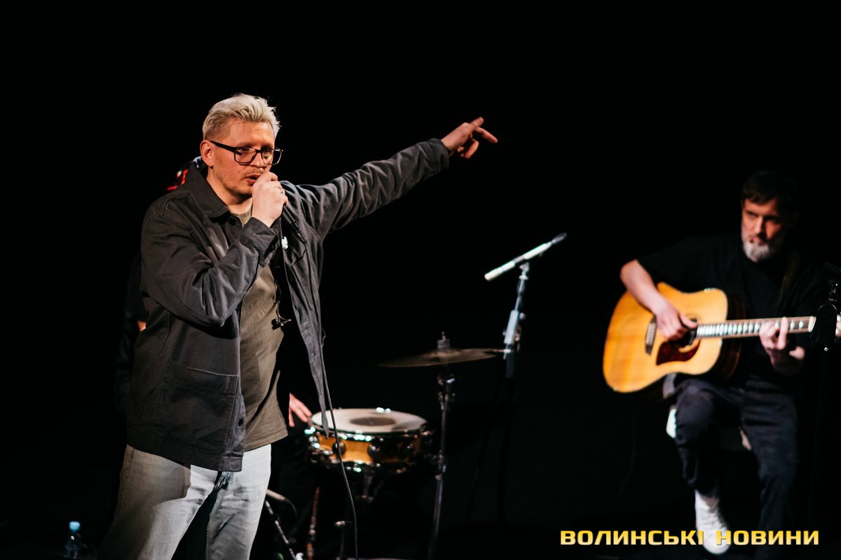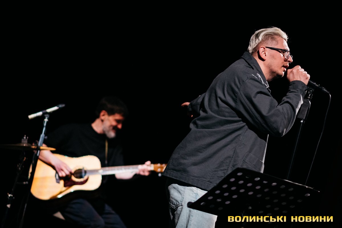 Неймовірно атмосферно звучали вірші Сергія Мартинюка в авторському виконанні.Під час концерту вже традиційно фронтмен «Фіолету» провів аукціон, кошти з якого підуть на «Мавіки» для 77-ї окремої аеромобільної бригади, яка працює на Купʼянському напрямку.«Ви знаєте, що «Мавіки» – річ недешева, але в умовах війни є розхідником. Тож ми із друзями з «Ангару» збираємо на них гроші. Маємо зібрати мільйон гривень. Вже понад 700 тисяч є, тож сподіваємося, що під час туру вдасться закрити цей збір і допомогти хлопцям та дівчатам», – висловив надію Сергій Мартинюк.І варто сказати, що шанувальники з Луцька його не підвели. Першим з молотка пішов канадський сухпайок для військових. Далі глядачам запропонували придбати синьо-жовтий стяг з автографами українських зірок. Неабияка боротьба між учасниками аукціону розгорнулася за торт із зображенням фронтмена гурту. Останнім лотом став оригінальний світшот, виготовлений у єдиному екземплярі.«Цей светрик наприкінці минулого року мені подарував один з побратимів. Светрик теплий, зимовий, з дуже прикольним принтом. Там написано «Нехай колоситься українська культура», а на колоску – багато моїх задуманих облич. І ми вирішили його, так би мовити, монетизувати. Такого ви точно більше ніде не знайдете», – заохотив Колос учасників аукціону.Читати ще: Українські актори знялися в поетичному проєкті для людей з порушенням слуху та зору