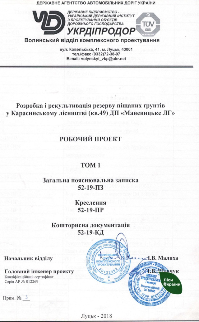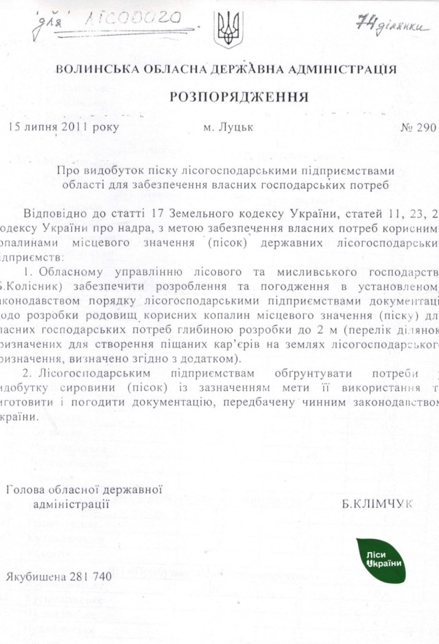Факт № 1. Кар’єр, про який йдеться, функціонує офіційно багато років! Є відповідне розпорядження Волинської ОДА 290 від 15.07.2011 року та інші необхідні документи (надамо у фото). Тож як мінімум дивно, чому саме зараз це «помітили» фахівці Держекоінспекції. Усі дозволи, погодження та документи є чинними й відкритими для перевірки. І вчора частина з них, яка знаходилася в лісництві, була відразу предʼявлена працівником лісової охорони екоінспекторам. Також було озвучено, що решта необхідних документів є в надлісництві.