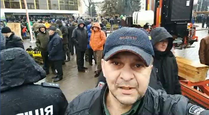 З відео видно, як Ігор Алексєєв хотів пройти до драмтеатру, проте дорогу перегородили не працівники поліції чи управління Держохорони, а лісівники.