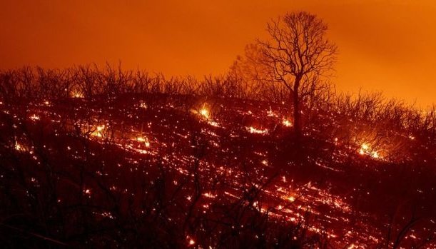Зазначається, що сильні вітри роздмухують вогонь і пожежникам важко дістатися усіх зон в лісі.
