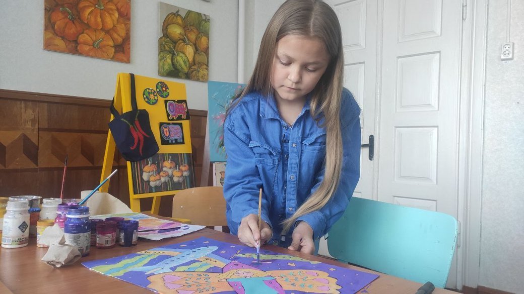 Зі слів школярки, вона продовжує малювати. Нині працює над роботою, де хоче зобразити, як палає флагман «Москва».
