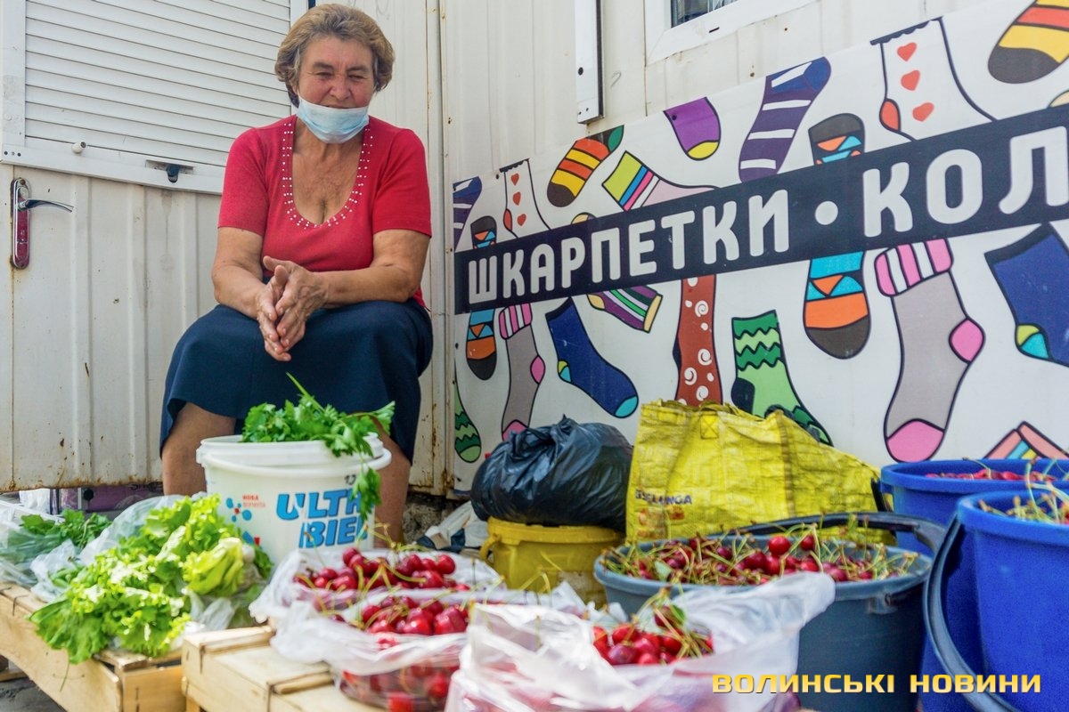 Пані Ніна на ринок приїхала з села Шепель Луцького району. Продає черешні, руколу, зелень і навіть молодий горошок. Каже, що у них цьогоріч усе вродило рясно, то є чим ділитися. Поратися на городі допомагають діти.«Хоч син з донькою мають свої сім’ї, та не цураються, приходять і помагають, – каже господиня. – А головний мій помічник – п’ятирічний правнучок».