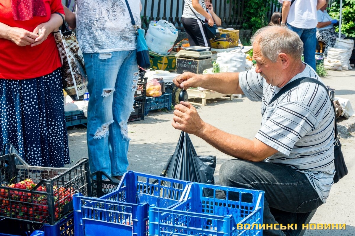 «Ходіть-но ще біля нас постійте, якісь ви такі, що за вами клієнт файно йде купувати», – чуємо віддаля жарт одного з продавців городини.А ми, як то кажуть, ідемо на запах: скраю торгового ряду запаморочливо пахне трохи нагрітою на сонці полуницею. Гарна, як намальована, дбайливо зібрана в ящики. Поряд у відерці – домашні яйця, в іншому – перші огірочки, у невеличкому мішку – молода картопля. Те все на продаж привіз пан Микола з села Колодеже, що на Горохівщині. Усе – з власного городу, на якому господарюють з дружиною та трьома синами.Усього землі родина обробляє чотири гектари. Картоплі – 24 сотки, ранньої вродило і для себе, і на продаж. Полуниця росте на 9 сотках. Каже, на врожай цьогоріч гріх нарікати, хоча через вибрики погоди ягода достигає пізніше.