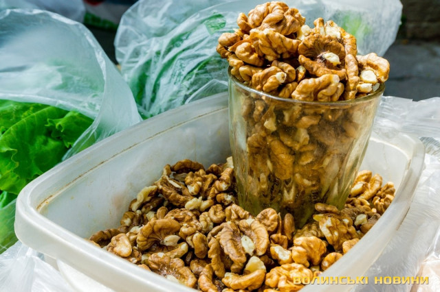 Окрім городини, пані Антоніна пропонує покупцям ще й лущені горіхи.«Удома ще маю 12 трилітрових банок таких, – хвалиться. – То теж наші горішки. Збираємо їх у себе в селі, тоді несемо на горище. А вже потім удома потихеньку лузаємо. Цього року сім мішків було, ще один зостався».