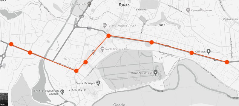 Перший міський автобусний маршрут і зупинки 1911 року на мапі сучасного Луцька
