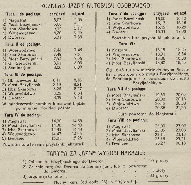 У 1924 році зафіксовано графік руху. Він дуже цікавий з огляду на зупинки і час руху автобусів між ними. У графіку подано й тариф на перевезення. Їздити вночі було на 50% дорожче.