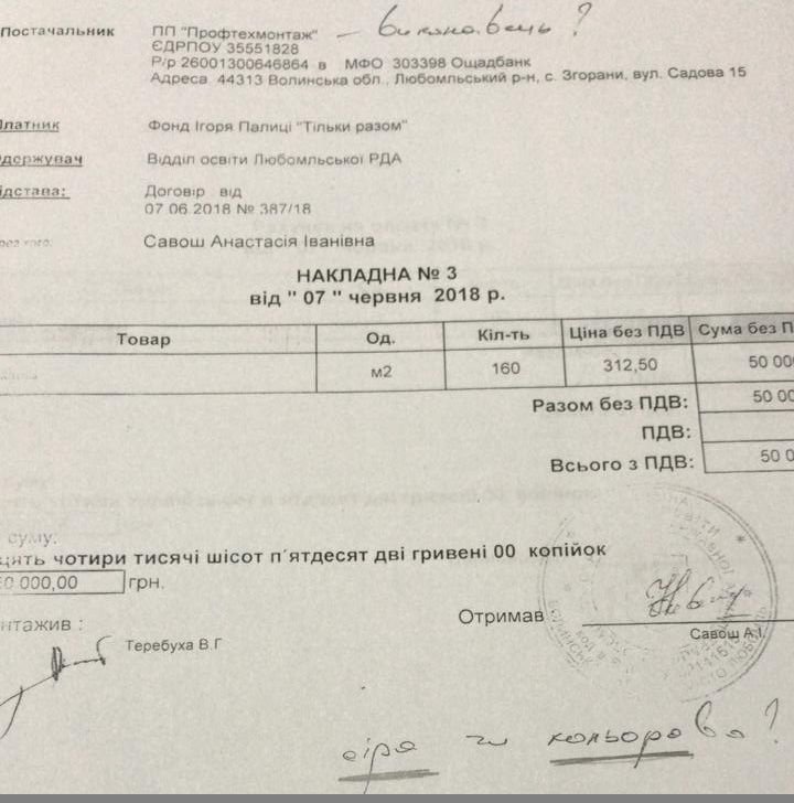 Як з’ясувалось, готуючи розрахунки, працівники відділу освіти передали у Фонд Ігоря Палиці накладну від місцевого підприємця ПП «Профтехмонтаж» Валерія Теребухи, який захотів за квадратний метр бруківки 312 гривень. Проте у накладній не вказали ні типу, ні кольору, ні товщини бруківки, через що інженер-кошторисник навіть не зміг перевірити, скільки аналогічна продукція коштує в інших підприємців.