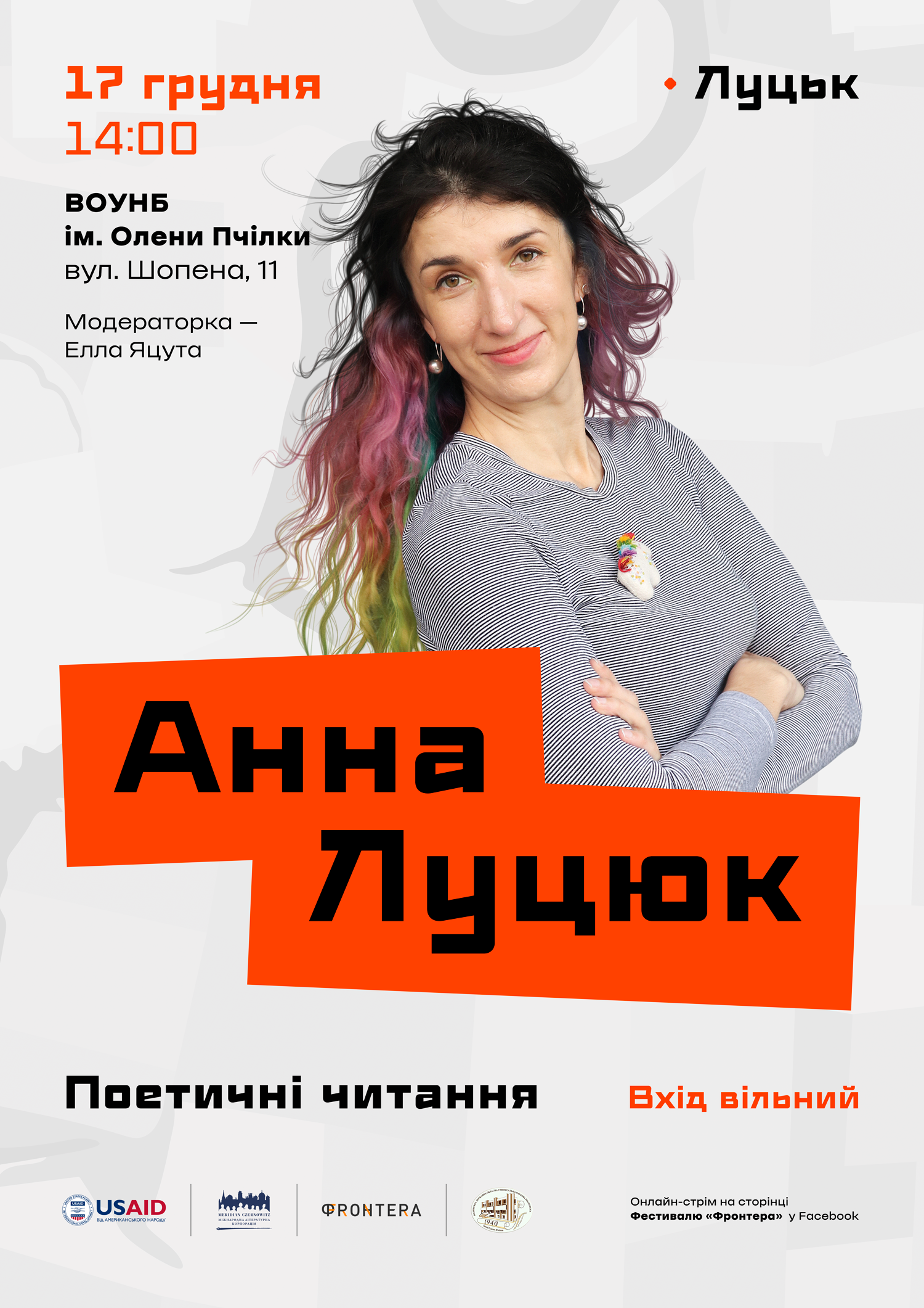 Анну Луцюк з луцьким середовищем об’єднує багато книжкових і душевних історій. У суботу вона, як завжди, приїде на трошки в місто Л(уцьк) із міста Л(ьвів), щоб лагідно говорити про любов і літо, згадати улюблені маршрути, обійнятися та посміятися з близькими. Будемо разом запалювати вогники і слухати вірші.