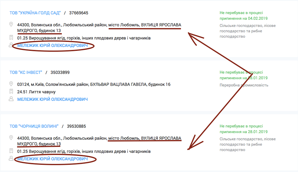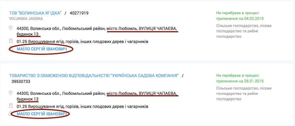 Повертаючись до «Волинської ягідки» варто зауважити, що вона зареєстрована за тією ж адресою, що й ТОВ «Українська садова компанія». Директором обох «ягідних» підприємств є Сергій Маїло. Кінцеві бенефіціари «Української садової компанії» – родичі того ж таки депутата облради В’ячеслава Богдана: матір Оксана та син Святослав.
