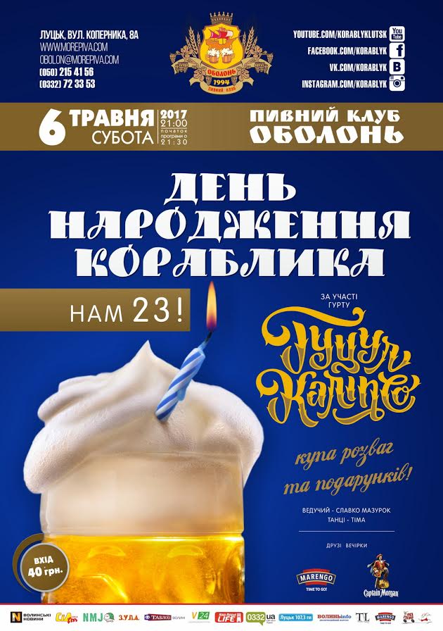 Луцькому пивному клубі «Оболонь», відомому у народі як «Кораблик», виповнюється 23 роки. Лучан та гостей міста запрошують розділити цю урочисту подію з улюбленим клубом. Захід відбудеться у суботу, 6 травня, о 21.30.