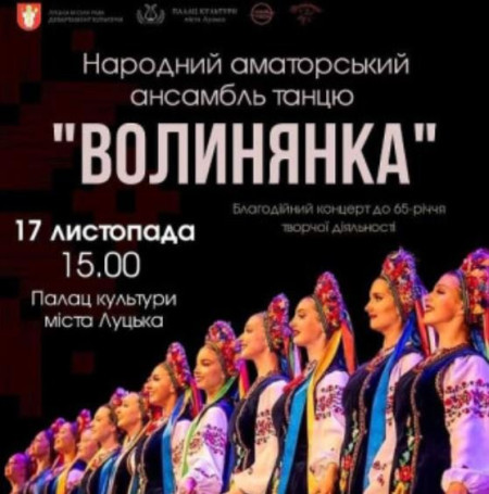 Благодійний концерт народного аматорського ансамблю танцю «Волинянка» відбудеться 17 листопада у Палаці культури міста Луцька.