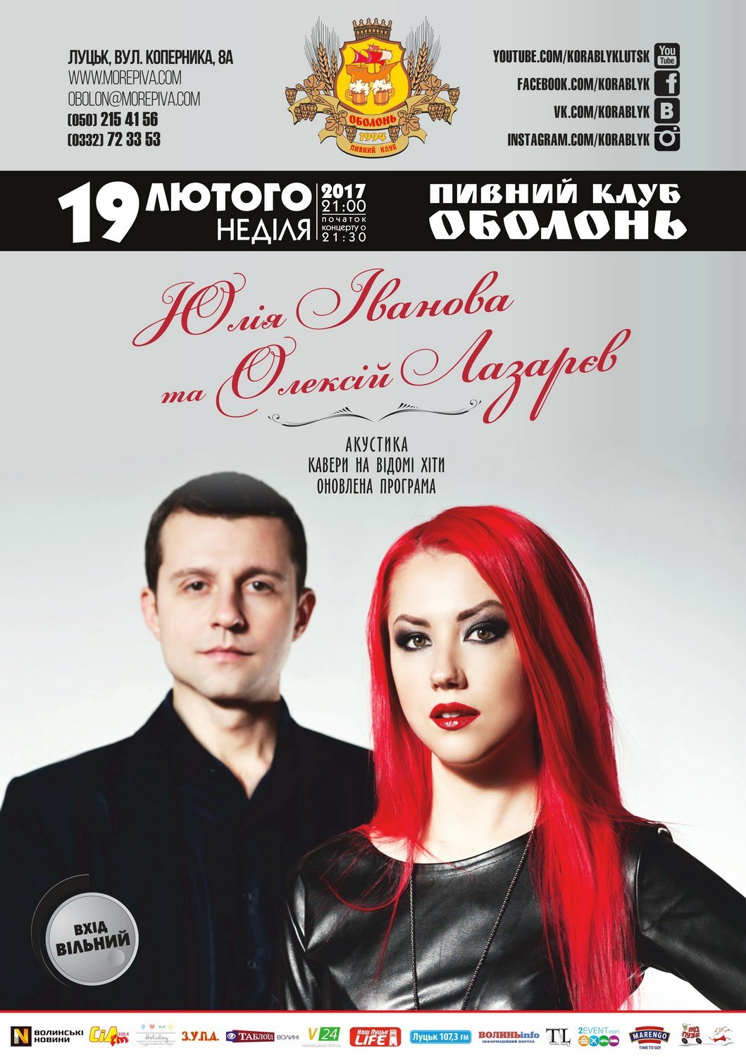 Юля Іванова та Олексій Лазарєв обіцяють лучанам добрячу порцію каверів на добре знайомі пісні. Вечірка відбудеться в «Кораблику» вже цієї неділі, 19 лютого.
