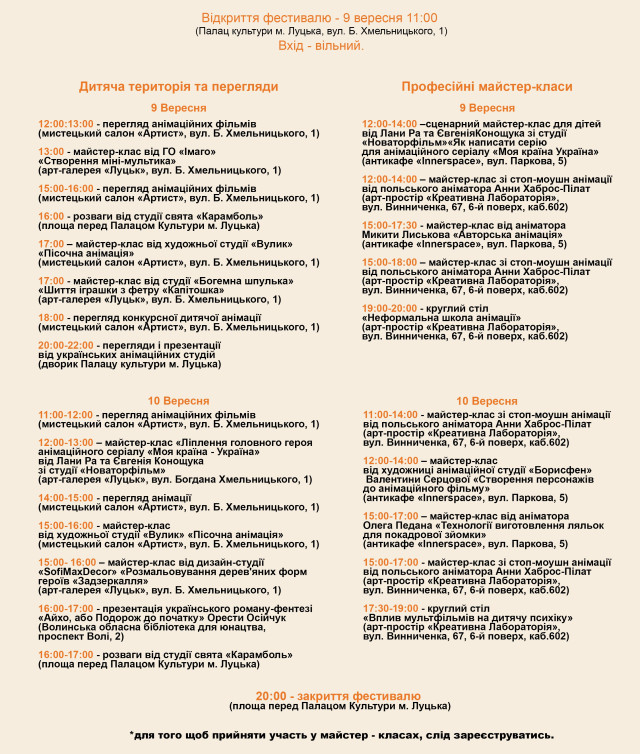 Окрім професійних фестивалів з анімації на відвідувачів фестивалю чекають також перегляди мультфільмів, розваги та майстерки для дітей. Відкриття фестивалю та святковий концерт відбудеться 9 вересня об 11:00 у Палаці культури міста Луцька (вулиця Богдана Хмельницького, 1). Вхід – вільний.