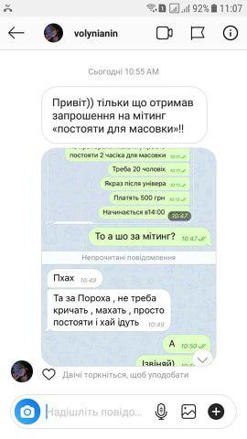 Зі слів молодого чоловіка, учора, близько 10-ї ранку йому написав знайомий. Він запропонував досить легкий, на його думку, вид підзаробітку – 14 березня, у день ймовірного приїзду гаранта до Луцька, бути присутнім із 14-ї до 16-ї години на Театральному майдані задля того, аби штучно створити кількісний показник людей, які буцімто «підтримують» та «з нетерпінням очікують» на візит Петра Порошенка.