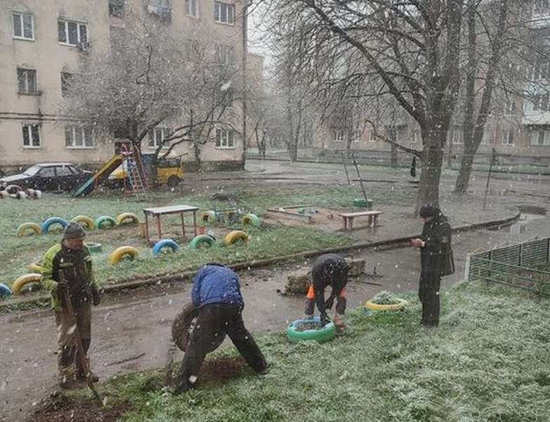 Дуже вдала фотографія. Доглянутий двір, чисто, шини гарно пофарбовані, пороблені маленькі клумби - зроблено з любов'ю і для мешканців і в тому числі для дітей. Муніципали як завжди це знищиили. А міськрада вже представила альтернативу (цікаво за чий рахунок) чи в зруйнованому дворі жити буде краще?