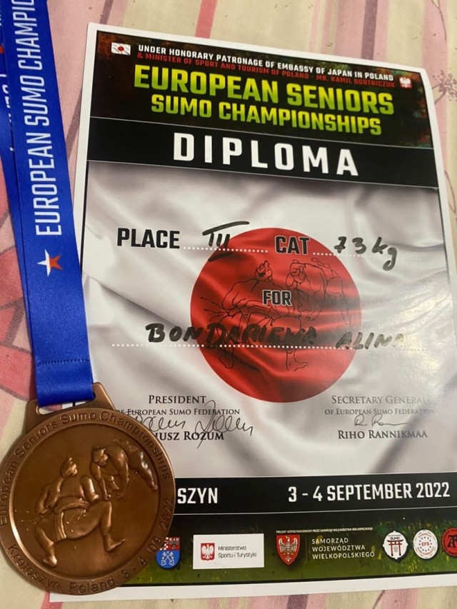 Спортсменка Аліна Бондарєва з Луцька виборола третє місце на чемпіонаті Європи з сумо. Змагання проходили в місті Кротошин (Польща).