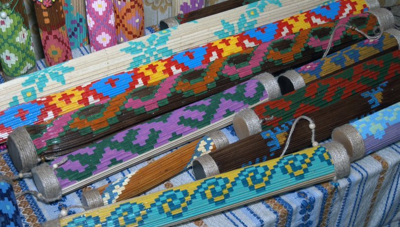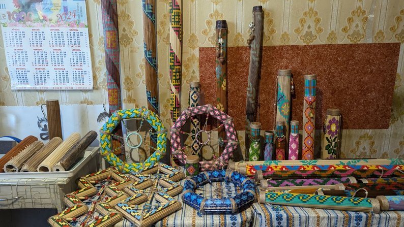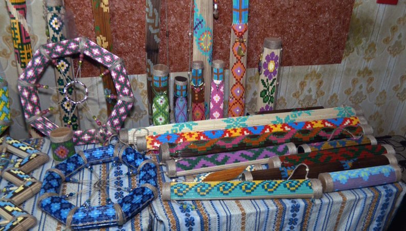 «Розміри від 1,80 до 2 метрів, й дитячі брязкальця. Я їх наповнюю бісером, щоб був дзвінкий звук. Деякі схожі на фігурки людей – плечі, голова, довгий одяг, і я придумала такі фігурки у виглядів мотанок. А ще я почала робити такі фігурки стилізовані», – розповідає Галина Бичкова.