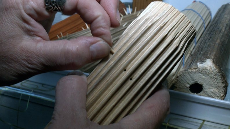Зібраний борщівник Галина Бичкова просушує і починає готувати для подальшої обробки. Уся її маленька кімната з роками перетворилася на майстерню.«Це стародавній музичний інструмент. В Південній Америці, в Африці його виготовляли з порожнистого стебла кактуса і як перетинки вставляли голки цього кактуса. В Карпатах теж такий інструмент є, називається хмара. Стародавні шамани, мольфари його використовували для спілкування зі стихією природи, зі стихією дощу. В йозі використовують для розслаблення нервів», – каже жінка.Як розповідає, вісім років тому на одному з ярмарків їй настільки сподобались дощовиці, що вирішила навчитися робити їх самотужки. Вивчала відео в інтернеті, радилася з майстрами. Процес створення інструментів настільки захопив, що виготовила вже орієнтовно тисячу дощовиць.«Борщівник порожній, тому по спіралі, як днк, робляться перемички, що сипучі речовини, які ви засипаєте, створюють звук дощу. Тому, щоб зробити дірочки, я вставляю зубочистки, – говорить майстриня. – Чим тонший діаметр – тим звук вищий, а чим товстіший – тим нижчий».Читати ще: Понад 100 мотанок за рік: волинська майстриня не втомлюється робити ляльки й донатити на ЗСУ