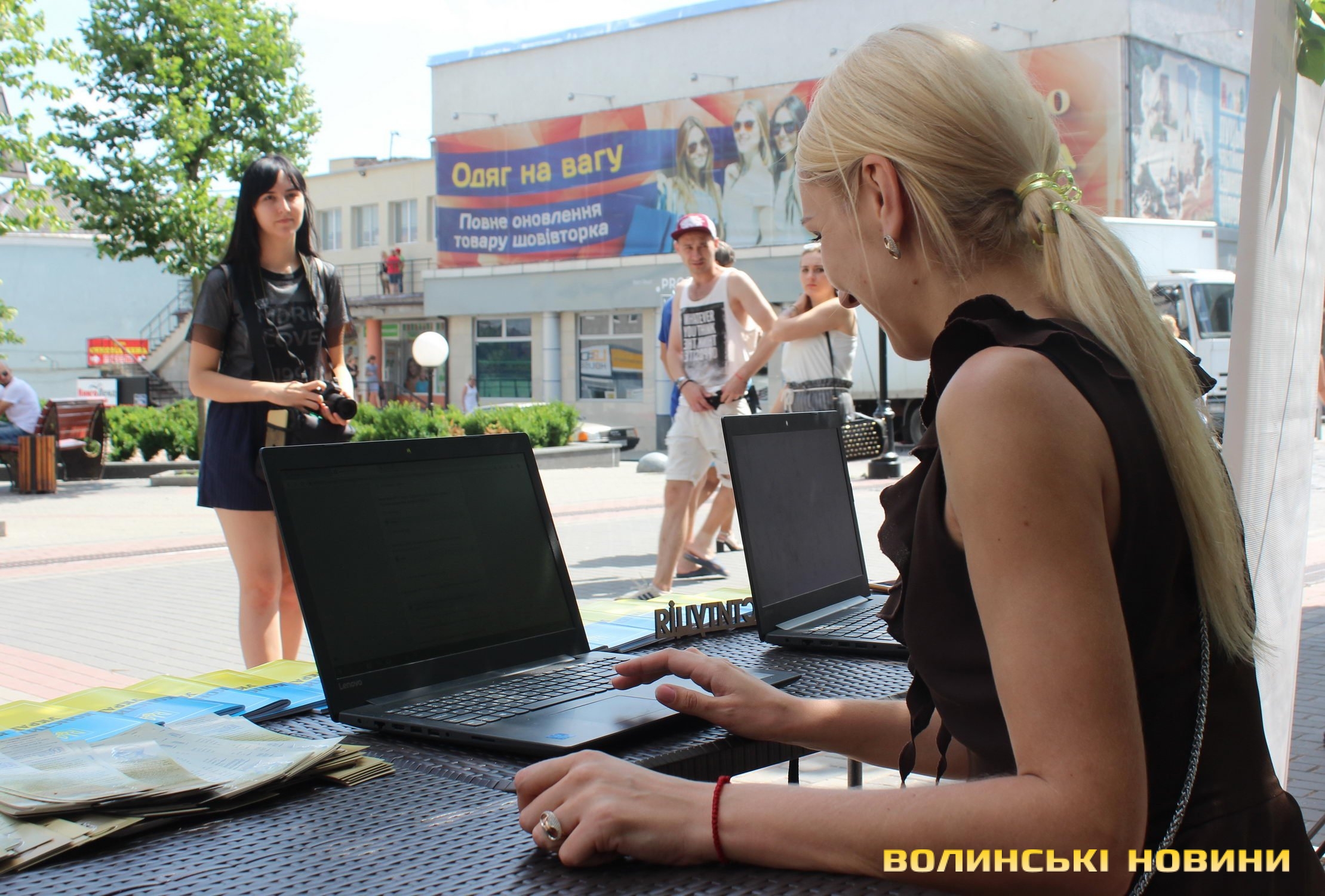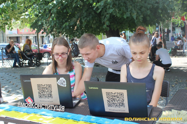 «Напередодні Дня Конституції ми захотіли перевірити, наскільки добре лучани орієнтуються в основному законі країни. Вирішили це зробити дещо нестандартним інтерактивним методом – на головній пішохідній вулиці Луцька ми розмістили інформаційну зону, де можна пройти тестування двома шляхами: за допомогою смартфона, зісканувавши QR-код, або за одним із наших ноутбуків», – сказала Юлія.І додала, що блок із 10 різноспрямованих запитань розробила самостійно на основі власних зацікавлень і даних відкритих джерел. Час проходження тестування не обмежено.